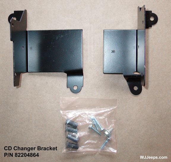 The metal mounting bracket for some reason is not available from Mopar as a separate part, it only comes with the CD changer unit kit. Sometimes these brackets can be found on the used market. If one cannot be located, the mounting bolts can still be installed to allow the use of a custom-made bracket. It may also be possible to modify a bracket that Mopar made a few years ago for the FM modulated CD changer system. The bracket is a little narrow but redrilling mounting holes may make it fit. Mopar mounting bracket P/N 82204864