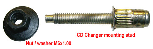 CD changer bracket mounting bolt location, close-up of bolt, and mounting bracket