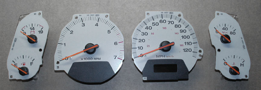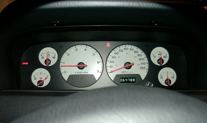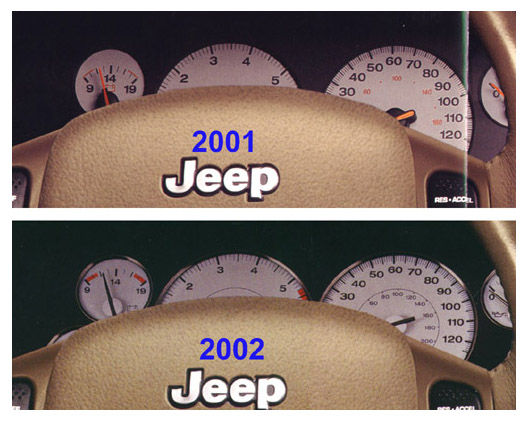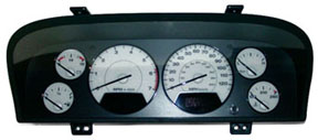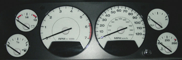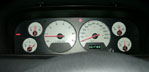 Some owners have installed 2001 Limited white face gauges into 1999 and 2000 Laredo models, purchasing just the individual gauge assemblies and installing them into their existing cluster assembly. Most likely the same thing can be done (installing a set of 2001 Limited gauges) into 2002-2004 Laredo models. 2001 is the only model year for which gauges can be purchased individually. This is a desirable upgrade as this method bypasses the added expense, exchange hassles and problems associated with trying to obtain an entire cluster, as the original odometer is left intact. However, buying a new set of the '01 Limited gauges can set you back more than $400 plus installation (2008 update: The 2001 individual gauges have been discontinued and are no longer available from Mopar).