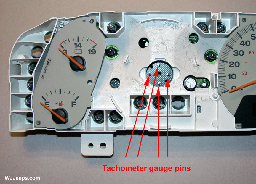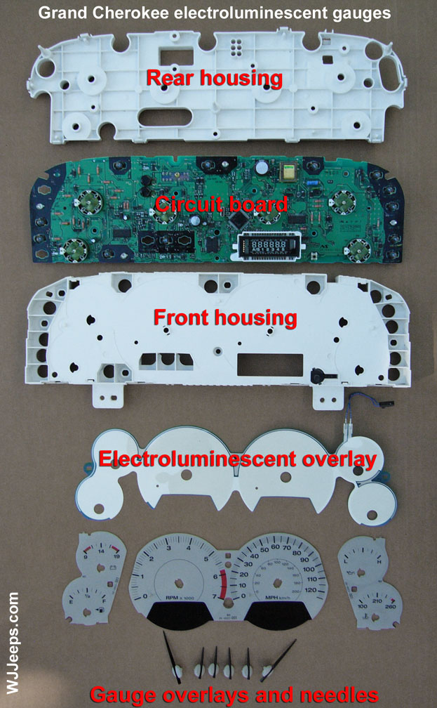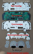 NOTE: 2002-2004 electroluminescent gauges that come on the Limited and Overland models cannot be individually removed from the cluster housing as they are sandwiched between the cluster housing (see "exploded view" photo showing the electroluminescent cluster parts at the bottom of this page).