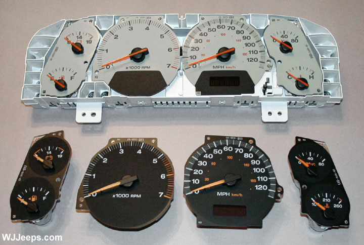 It is physically possible to install, for example, the 2002-2004 electroluminescent clusters into 1999-2001 WJ models, and all of the gauges will work perfectly. However, the odometer *might* retain the previous mileage from the vehicle it came out of, or "000000" if it is new and would need to be reprogrammed. Some of the other functions, like the seat belt warning light may not work so this may not the best upgrade choice. We have recently heard of one case of a '99 owner who successfully swapped an '04 electroluminescent gauge cluster into a '99 Laredo and had no issues. Your mileage may vary.