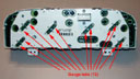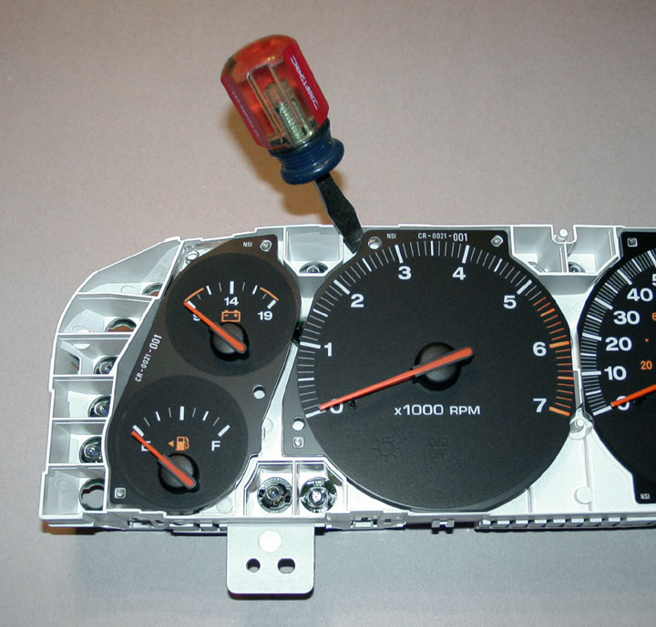 4. Next remove each of the 4 gauge assemblies. With a small flat blade screwdriver, carefully pry up on the corners of each plastic backing a little at a time. This will free the gauge pins from their sockets. The Tach and Speedometer each have 4 pins while the two sets of double gauges each have 8 pins. The gauges will lift up rather easily, they are not secured real tight.