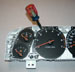 Factory gauge overlays are made of thin plastic. The numerals and markings are printed on the overlays in blue and are back-lit with 5 clear bulbs that can be removed from the back of the cluster. The bulbs can then be replaced with different color bulbs, painted different colors, or colored sheaths that go over the clear bulbs can be installed. Different results will be achieved with different color bulbs or bulb covers, but all will be "mixed" with the factory blue that is on the overlay. I will try and provide some pictures in the future of different results achieved with using colored bulbs.