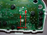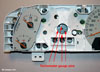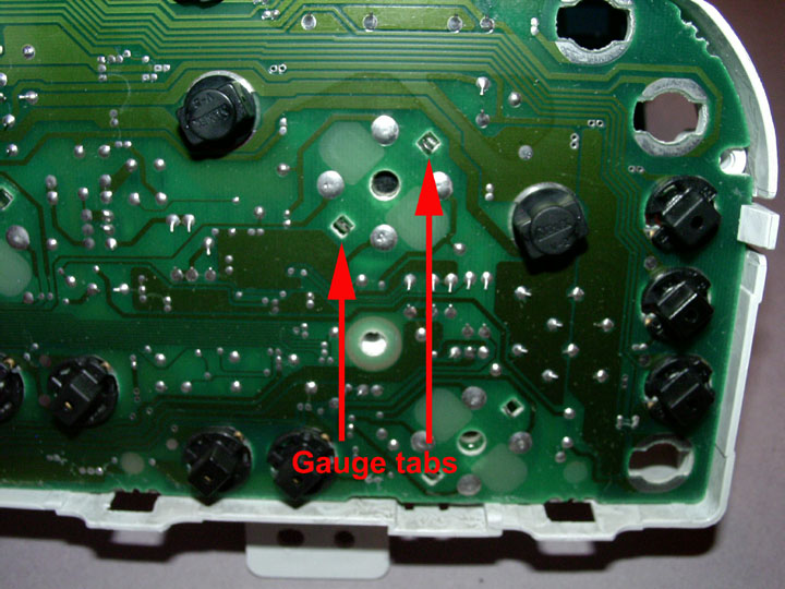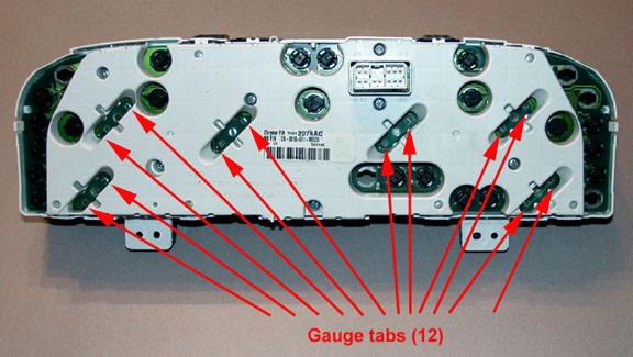 2. Lay the cluster upside down on a soft towel. As shown in figure "A", each gauge has a pair of metal tabs (12 in all) that secure the gauge to the circuit board. Bend each tab upwards with a small screwdriver or pair of needle-nose pliers. All of the tabs are accessible without removing the white rear plastic cover. Figure "B" shows a close-up of a pair of the tabs.