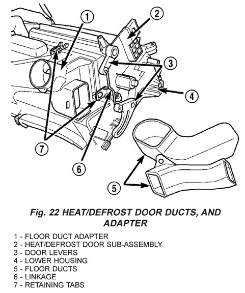 1. Remove the evaporator, and styrofoam tray from the lower case. 2. Place the HVAC housing upside down on a work bench. 3. Unscrew and remove the 2 floor heat ducts. 4. Unsnap and remove the duct adapter from the bottom of the heat/defrost door sub-assembly (Fig. 22).