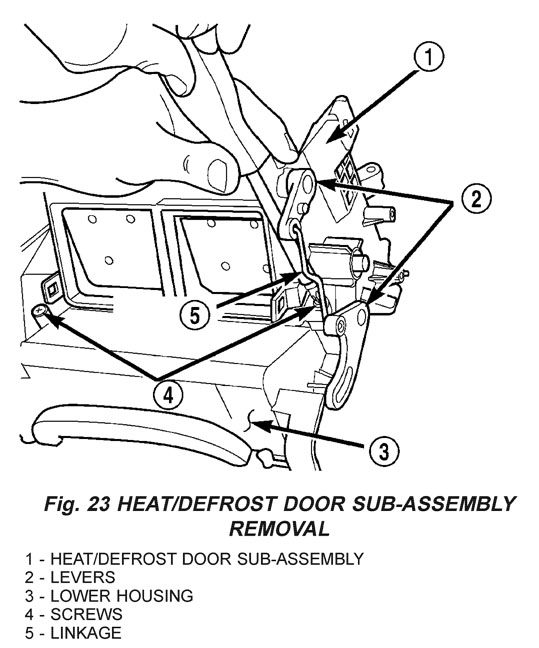 6. Remove the heat/defrost door sub-assembly, which is attached to the housing with 4 screws (Fig. 23). 7. Pinch the retention tabs holding the heat/defrost door pivot shaft lever to the case. The 3 plastic tabs, located on the inside of the case, are part of the shaft retainer. 8. Remove the heat/defrost door (Fig. 24).