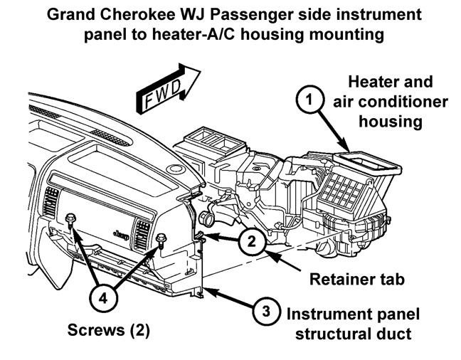 The HVAC housing assembly must be removed from the vehicle and the two halves of the housing separated for service access of the heater core, evaporator coil, blend door(s), and each of the various mode doors. WARNING: ON VEHICLES EQUIPPED WITH AIRBAGS, DISABLE THE AIRBAG SYSTEM BEFORE ATTEMPTING ANY STEERING WHEEL, STEERING COLUMN, OR INSTRUMENT PANEL COMPONENT DIAGNOSIS OR SERVICE. DISCONNECT AND ISOLATE THE BATTERY NEGATIVE (GROUND) CABLE, THEN WAIT TWO MINUTES FOR THE AIRBAG SYSTEM CAPACITOR TO DISCHARGE BEFORE PERFORMING FURTHER DIAGNOSIS OR SERVICE. THIS IS THE ONLY SURE WAY TO DISABLE THE AIRBAG SYSTEM. FAILURE TO TAKE THE PROPER PRECAUTIONS COULD RESULT IN AN ACCIDENTAL AIRBAG DEPLOYMENT AND POSSIBLE PERSONAL INJURY. 1. Disconnect and isolate the battery negative cable. 2. Remove the instrument panel from the vehicle (see Part 1 - Instrument panel removal) 3. Recover the refrigerant from the refrigerant system. 4. Disconnect the liquid line refrigerant line from the evaporator inlet tube. Install plugs in, or tape over all of the opened refrigerant line fittings. 5. Disconnect the suction line refrigerant line from the evaporator outlet tube. Install plugs in, or tape over all of the opened refrigerant line fittings. 6. Disconnect the heater hoses from the heater core tubes. Clamp off the heater hoses to prevent loss of coolant. Refer to Cooling for the procedures. Install plugs in, or tape over the opened heater core tubes.