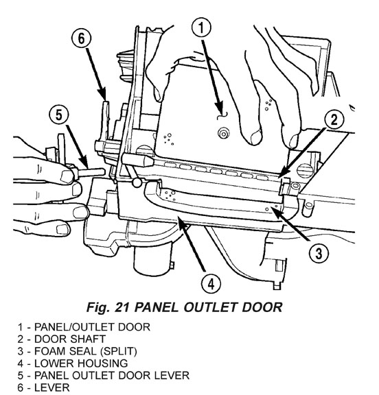1. Pinch the retention tabs holding the panel outlet door pivot shaft to the case. The 3 plastic tabs, located on the inside of the case, are part of the shaft retainer (Fig. 21).