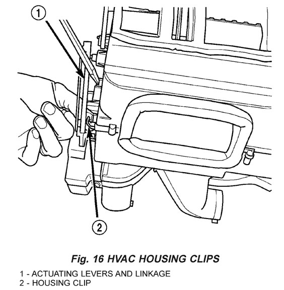 1. Install the blend door(s) by snapping the pivot shaft into the HVAC case. 2. Install the evaporator in the lower case. 3. Reassemble the HVAC housing and install in the vehicle. NOTE: The blend door sub-assembly is attached to the housing with 2 screws, and may be removed for service (Fig. 19).