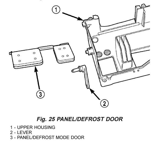 1. Pinch the retention tabs holding the panel/defrost door pivot shaft to the case. The 3 plastic tabs, located on the inside of the case, are part of the shaft retainer (Fig. 25). 2. Using a trim stick or another suitable wide flat-bladed tool, gently pry the panel/defrost door pivot shaft retainer from the pivot shaft. 3. Remove the panel/defrost door from the HVAC housing.