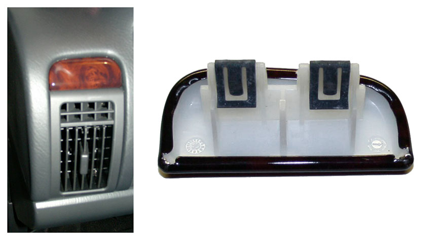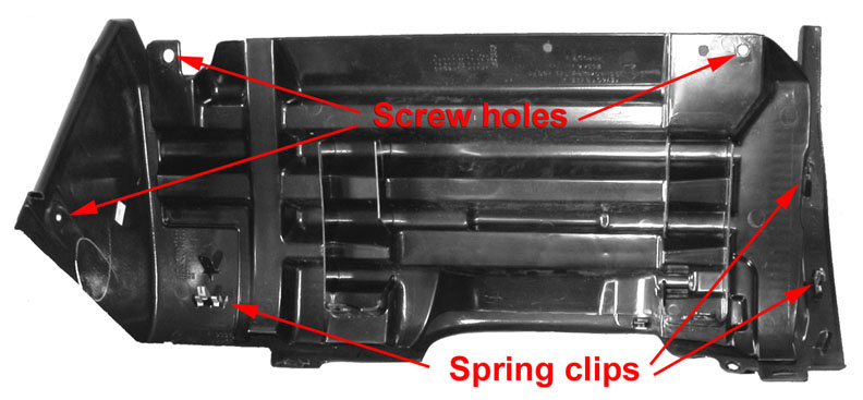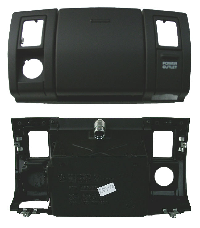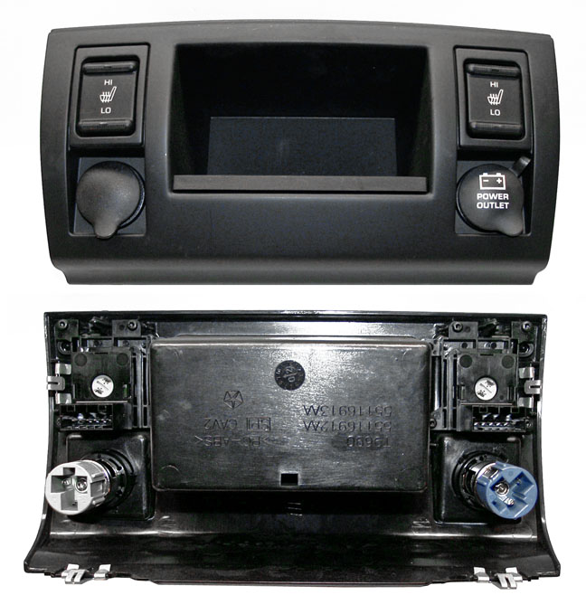 Shown above left is the black lower center bezel, front and back (with power outlet and seat switches not installed). Above right, the new style with a cubby hole instead of the ashtray that debuted on the 2003 models. The bezel is attached to the instrument panel with four spring clips.