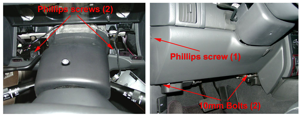 4. Remove the side Phillips screw and the two 10mm bolts underneath the bezel trim (upper right photo).
