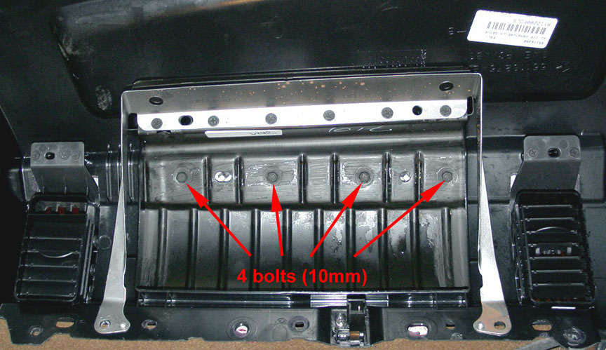 View from behind the glovebox area showing the four bolts that attach the long trim strip. Also seen in the photo are two of the air vents, which are also attached from the rear with screws.