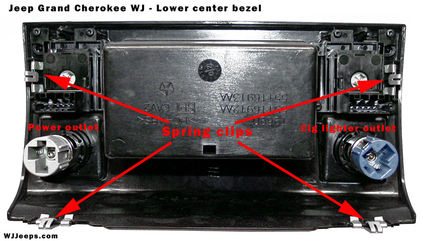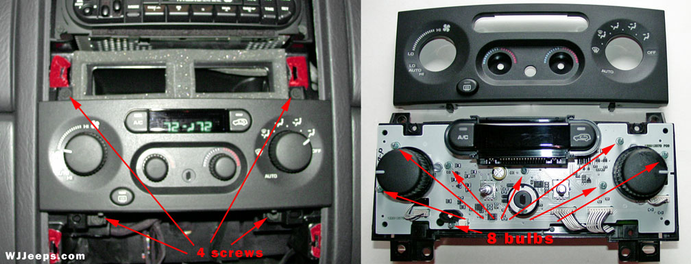 Climate control, Automatic (P/N 5013123AA graphics, P/N 5013124AA knobs) Eight climate control lamps are soldered onto the internal circuit board of the Automatic Zone Control assembly. These are unlikely to burn out for many years, but some owners have wanted to color the bulbs. To remove the AZC unit, the radio bezel and the lower bezel assembly must be removed. Both bezels are pried out using a flat hard plastic blade tool (see ashtray lamp section above). The AZC unit is held in place by 4 Phillips screws. After removing the screws slide the unit out and unplug the two wiring harnesses in the rear. To open the unit, remove the two smaller knobs in front by pulling them straight out. Then remove the 4 rear screws with a Torx T-20 screwdriver to separate the front plate. Note: The AZC controllers for model years 2003-04 were reprogrammed. The factory suggests that these not be installed in 1999-2002 vehicles. Also, the AZC controllers can not be installed into models with manual controls.
