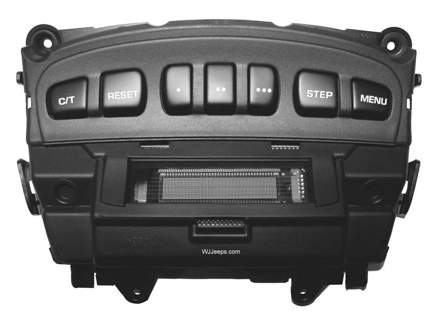 EVIC (Electronic Vehicle Information Center) (Mopar # 04437661) Four bulbs are used for backlighting the C/T, Reset, Step, and Menu buttons on the EVIC. The four bulbs can be seen along the top of the circuit board, shown in the photo above right. To access the bulbs, the overhead console must first be removed (see directions above under "Dome / Reading"). Remove the four phillips screws that attach the EVIC module to the overhead console housing (shown in center photo above). The EVIC module can be opened by prying the tabs on the side. The circuit board will then lift right out and the bulbs can be replaced.