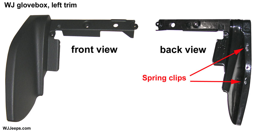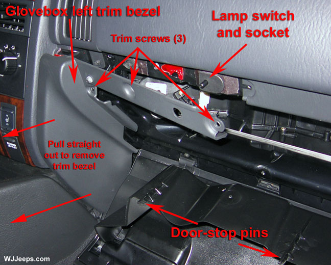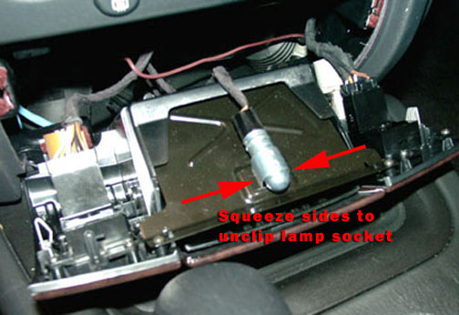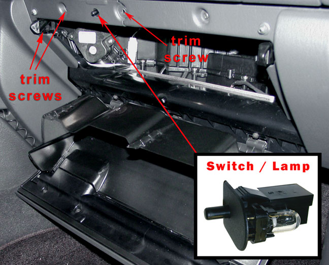 Glove box (# 194) 1. Empty contents of glove box. 2. Loosen or remove bezel trim piece - The bulb socket can be accessed by removing just two of the three bezel cover screws, which will allow the top right of the bezel piece to be pulled out far enough to pull the socket through. However, to make things a little easier it is not too difficult to remove all three screws and the trim bezel entirely. It is held in place by two strong spring clips. Grasp the bezel at the bottom, around the back edge, and firmly pull or jerk it forward and away. 3. Roll the glovebox down. This is done by reaching in to the top inside of the glove box with both hands, in front of the sharp plastic guide pins, and with your middle fingers pushing each rubber stopper up and out of the way to let the pins pass by and the glovebox drop down. Note: Some models may feature a pneumatic glove box damper on the right side of the glove box. The arm of the damper must be lifted upwards to remove it from its keyed slot. 3. The socket is held in place with two plastic retaining tabs, one at the top and one at the bottom of the switch. It's a tight fit to get your finger over the top clip to try and release it, but that is not really necessary, the socket can be removed by just depressing the bottom tab. To do this, use your right hand middle finger to press up on the bottom of the lower retaining tab, while at the same time reaching in and under the socket with your left forefinger and thumb to wiggle and push the socket forward. This will release the socket from the bottom at an angle, enough so that you can now grab it from the front lip cover while still pushing it from the back to wiggle it free from its mounting hole.