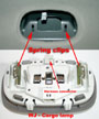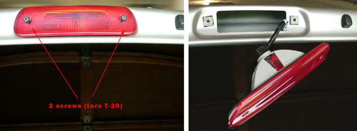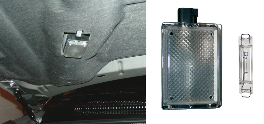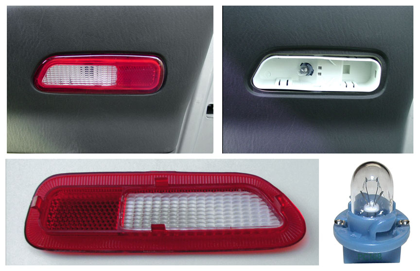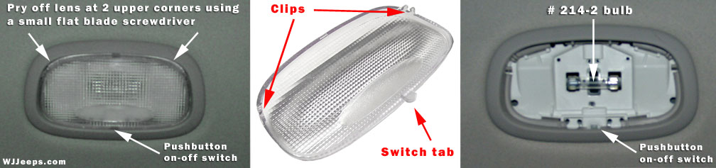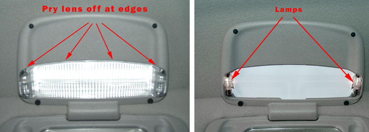 Cargo area (# 214-2) Using a very small flat blade screwdriver, pry the lens away from the corners as shown in the left photo. When replacing the lens cover, align the push-button switch tab into its slot first and then snap into place the two lock clips.