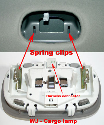 If you need to remove the cargo lamp housing, remove the liftgate upper trim piece to gain access to the lamp housing. The trim piece is held in place with four spring clips. Pull down to release the clips, and then pull straight back to disengage from the headliner. The lamp housing is attached with two spring clips.