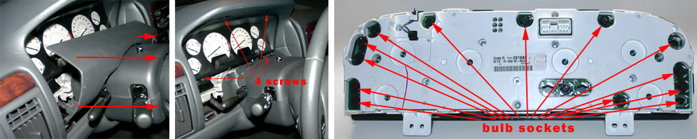 The gauge cluster is surprisingly easy to removed. First, remove the cluster bezel trim piece that is above the steering wheel. It is held in place by 4 spring clips, one at each corner, and pulls straight out. On the left side, you can reach your thumb behind the bezel rubber at the tilt wheel lever cut-out and pull forward. 2003-2004 models do not have the rubber piece but you can still reach behind the bezel in the same although there is less room for your fingers. If so equipped, you'll need to unhook the power pedal harness on the back of the switch. Next, remove the 4 phillips screws on the cluster assembly, two along the top and two on the bottom. At the two upper screw holes there are tabs that must be slightly pried down to release the cluster, which you can then pull outward and away. There is plenty of slack allowed to conveniently unhook the single 9-wire/12-slot harness. Note: The amount of replaceable bulbs and their locations may vary somewhat by year, model and options. Typically, there are five #103 bulbs used for backlighting the cluster (except lectroluminescent clusters) and anywhere from 12-20 PC74's used for the different status and warning lights. To remove the sockets, twist one-quarter turn. The bulbs can then be wiggled out from the sockets. WARNING: On vehicles equipped with the premium instrument cluster, the cluster circuitry provides an alternating current to supply power to the electroluminescent illumination lamp through a pigtail wire and connector that is accessible at the back of the cluster housing. Use proper precautions when handling this unit during diagnosis or service to avoid electrical shock and possible personal injury.