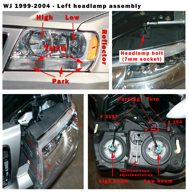 Courtesy light, front doors (# 192) Note: Lens cover = p/n 56005077 (left) and p/n 56005076 (right) The lens cover can be pryed off from the front with a small flat-blade screwdriver. However, at least for model years 2002-2003, the bulbs are part of the socket and must be removed from the back, inside the door panel. The door courtesy lights were eliminated starting with the 2004 model year. Removing the bulb is actually quite easy to do without having to remove the entire panel. 1. Remove one screw, the phillips screw located inside the door pull. 2. With a flat blade tool (like a hard plastic putty knife), pry the lower outside edge of the door panel up enough to unfasten the side trim clips, and perhaps one more in the bottom area. 3. Reach inside the door panel edge and remove the bulb/socket from the back of the housing (turn socket 1/4 turn counter-clockwise). Note: When pushing the side of the door panel back on make sure the clips are aligned with their holes.