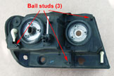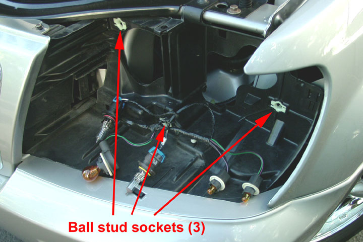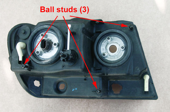Open the hood, and using a 7mm socket remove the long headlamp jackscrew, located as shown in the photo above, 2nd from left. Grasp the headlight assembly on the upper inboard and lower outboard corners and wiggle and pull very firmly outward to disengage the 3 ball stud alignment posts from their sockets (be cautious of the sharp edges of the grille and fender areas surrounding the headlamp). The location of the 3 mounting sockets and ball studs is shown in the photos below. Note: Use caution when removing and handling the headlamp assembly. The headlamp beam adjustment shaft on the rear center of the housing is very brittle and can easily be broken. Tip: Apply a small amount of grease to the 3 alignment posts when reinstalling the headlamp housing, this will make it easier to remove in the future.