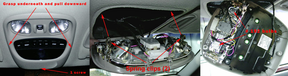 Dome / Reading (# 192) Two dome / reading lights are located in the overhead console. To remove the console, remove the single phillips screw located near the windshield side. The screw should be removed with a non-magnetic screwdriver as to avoid interference with the compass. The console is also held in place by two spring clips. Grab the console from the sides, wedging your fingers underneath it, and carefully and firmly pull it straight down.