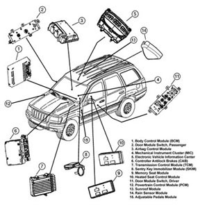 | 12. Powertrain Control Module | PCM (JTEC) | On the cowl panel, right rear side of the engine compartment. | The PCM is a pre-programmed, triple microprocessor digital computer. It regulates ignition timing, air-fuel ratio, emission control devices, charging system, certain transmission features, speed control, air conditioning compressor clutch engagement and idle speed. The PCM can adapt its programming to meet changing operating conditions. |