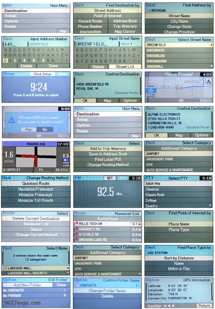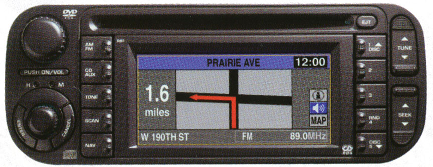 Address book - Store up to 100 personal locations and phone numbers in the system's memory, and create up to ten customer address book folders. Coverage - There are currently more than 2,600 cities in the U.S. that are mapped with detailed coverage. An updated database disc (P/N 56038642AF) was released in July, 2003. The next data update is scheduled for July 2004. Other minor changes or tweaks will be made in between the major annual upgrades. Database - Designed and maintained by NAVTECH, a leader in NAV systems technology. GPS clock - With 8 satellites feeding the GPS-based system, you can quickly adjust your clock to the time zone in which you are traveling. Time is also displayed directly on the map along with your estimated time of arrival, or estimated drive time remaining. In-motion operation - As a special safety feature, the Mopar RB1 Navigation Radio limits the availability of certain navigation tasks while the vehicle is in motion. Programmable options such as editing the personal address book or inputting a destination will be unavailable and grayed out until the vehicle comes to a complete stop. In addition, when in motion, Point of Interest selections are limited - you can only choose from a list of the last 5 POI listings that were entered. Note: Starting with DVD disc release P/N 56038642AG (September 2003), the in-motion operation safety feature was revised to allow operation of all functions while traveling under 10mph (convenient while in bumper-to-bumper traffic). Note: (summer 2008) An in-motion software "hack" has been developed by some enthusiasts. This involves burning a patch file to a disc and loading the disc into the RB1 to update the firmware. This modification is suggested "for off-road use only" and requires the 05064033AF disc software. Maneuver list - Allows you to review your trip itinerary before you put your vehicle in gear...so if there's a road in your route that you'd rather avoid, you simply tell the system, and it recalculates a new route. Mapping your destination - 8 ways: Map cursor - When taking a trip you can access a map of the location you are visiting. You can move your map cursor to a specific coordinate and, by simply hitting "enter", the system will show an address (or coordinates) for that selected site and create a trip route directly to your final destination...even if it's a thousand miles away. Map zoom - You can select from 9 different zoom scales to increase or decrease map magnification, from 1/20th of a mile up to 350 mile "birds-eye view". Orientation - The default orientation is "North" on the top of the display. It can also be set to "follow" mode where the direction you are currently traveling is on top. Points of Interest function - Select the service or business you'd like to visit from a database containing thousands of addresses. With a few touches of a button, you're mapped and ready to roll. Features over 40 main categories to choose from, including ATM's, Hospitals, government offices, restaurants, gas stations, hotels, grocery stores, auto service stations and more. Route Guidance - You have the option of viewing a turn-by-turn map, full display map, or a combination of both. Roads are classified from 1-5, with a level 1 road being the highest level road such as a highway or freeway, and a level 5 road, for example, may be a country road in a rural area. Generally, the system will try to direct you to the "highest level" road. When you are on "minimize freeways", the system will try to route you on the most direct streets. The system does not have the capacity to track your movements or memorize your favorite routes. Routing methods - Quickest Route, Minimize Toll Roads, Maximize Freeways and Minimize Freeways provide unmatched customization. Route Recalculation (automatic) - If you encounter a detour, miss an exit or make a wrong turn the RB1 adjusts to keep you on track. Should you change course from the directions indicated on the display monitor for any reason, the system can automatically recalculate your position, then select and display a new route. Screen - The screen can be toggled between the NAV display and the Radio/clock display. The power must be on in order to see the clock display. Smart Key Filtering - When using the digital keyboard to input information, the system makes educated guesses based on previously entered letter combinations and displays only the characters necessary to input your destination Trail Function - The RB1 features a program developed specifically for off-road use. You can get longitude, latitude and altitude readings. You can also mark, name and save the location so you can find it again on a later trip. And, if you should really get into the scenery and lose your way, you'll discover the unique program has been dropping "bread crumbs" as you've been making your trail, so backtracking to get to your original trailhead is a breeze! The "bread crumbs" tracking feature works only in the Trail Function mode, and will retain in its memory about 150 miles of traveling. Trip Itinerary - When multiple stops must be navigated, the RB1 can accept up to 10 locations, and then will create the most efficient route to accommodate all destinations in the shortest amount of time. Yellow pages - Over 5 million business phone numbers are included on the DVD program. Voice Guidance options - The RB1 not only points the way...but it talks to you! When to turn, and how soon, mile by mile, turn by turn, until you reach your final destination. One of three languages can be selected - English, French-Canadian or Spanish. While in the radio or CD mode, the voice prompt (if activated) will override the radio sound momentarily. The NAV voice volume can be set independently of the radio volume. You can choose from four voice options: 1. Maximum (two beep tones and voice) |