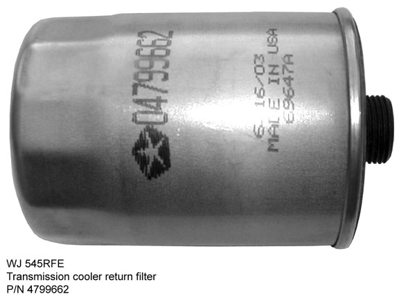 2. Place replacement filter in position on valve body and into the oil pump. 3. Install screw to hold filter to valve body. Tighten screw to 40 in. lbs. (4.5 N·m) torque. 4. If changing cooler return filter, install new one onto the transmission. Torque the filter to 125 in.lbs. (14.12 N·m) (NOTE: cooler filter is only used on the 45RFE and 545RFE transmissions). 5. Place 1/4" or so bead of Mopar RTV sealant onto the transmission case sealing surface (45RFE and 545RFE). For 42RE transmission reinstall gasket or install new gasket. 6. Place pan in position on transmission. 7. Install bolts to hold pan to transmission. Carefully tighten bolts to 105 in. lbs. (11.8 N·m) torque. Allow RTV sealant to set for 15-30 minutes (45RFE and 545RFE). 8. Lower vehicle and fill transmission with Mopar ATF +4, as described in the Fluid Fill steps below.