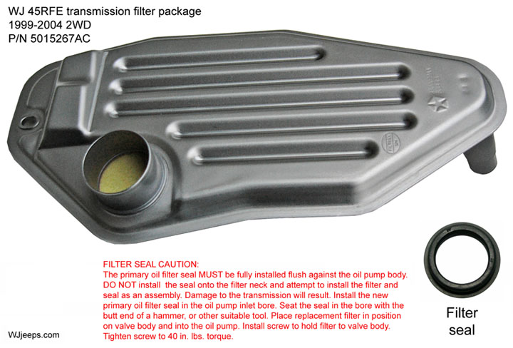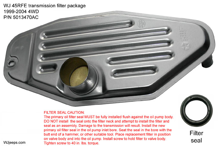 To avoid overfilling transmission after a fluid change or overhaul, perform the following procedure: 1. Remove dipstick and insert clean funnel in transmission fill tube. 2. Add following initial quantity of Mopart ATF +4 to transmission: (a) If only fluid and filter were changed, start by adding 10 pints (5 quarts) of ATF +4 to transmission. (b) If transmission was completely overhauled and the torque converter was replaced or drained, start by adding 24 pints (12 quarts) of ATF +4 to transmission. 3. Check the transmission fluid level and adjust as required by following the CHECKING THE TRANSMISSION FLUID LEVEL directions above. ADDITIONAL TRANSMISSION INFORMATION Chrysler published detailed transmission repair / adjustment / service information available for download here at wjbible.com. Please see the following page for WJ service manual downloads, and reference the transmission section: |