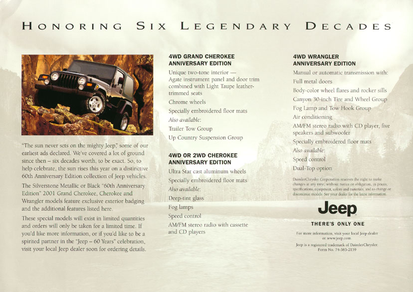 During the 2001 model year, a special 60th Anniversary Edition of the Jeep Grand Cherokee was produced. Offered in two colors only, Black and Silverstone Metallic, they were available for a limited time only, starting February 5th 2001. A reported 3,822 of the Grand Cherokee versions were built, 1,821 black and 2,001 silver color models. They came with exclusive exterior badging plus these additional features: