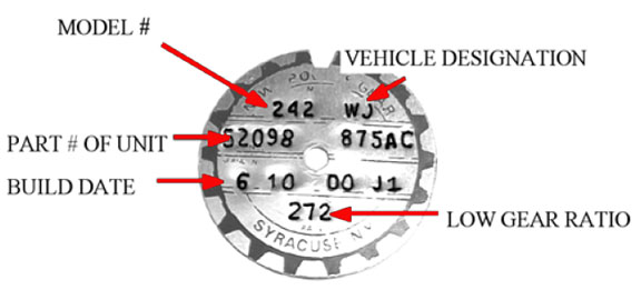 A circular ID tag is attached to the rear case of each transfer case. The ID tag provides the transfer case model number, assembly number, serial number, and low range ratio. The transfer case serial number also represents the date of build.